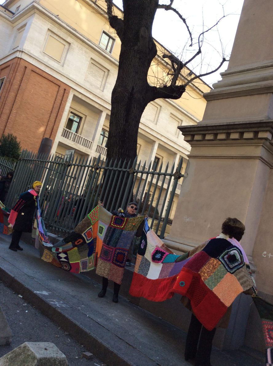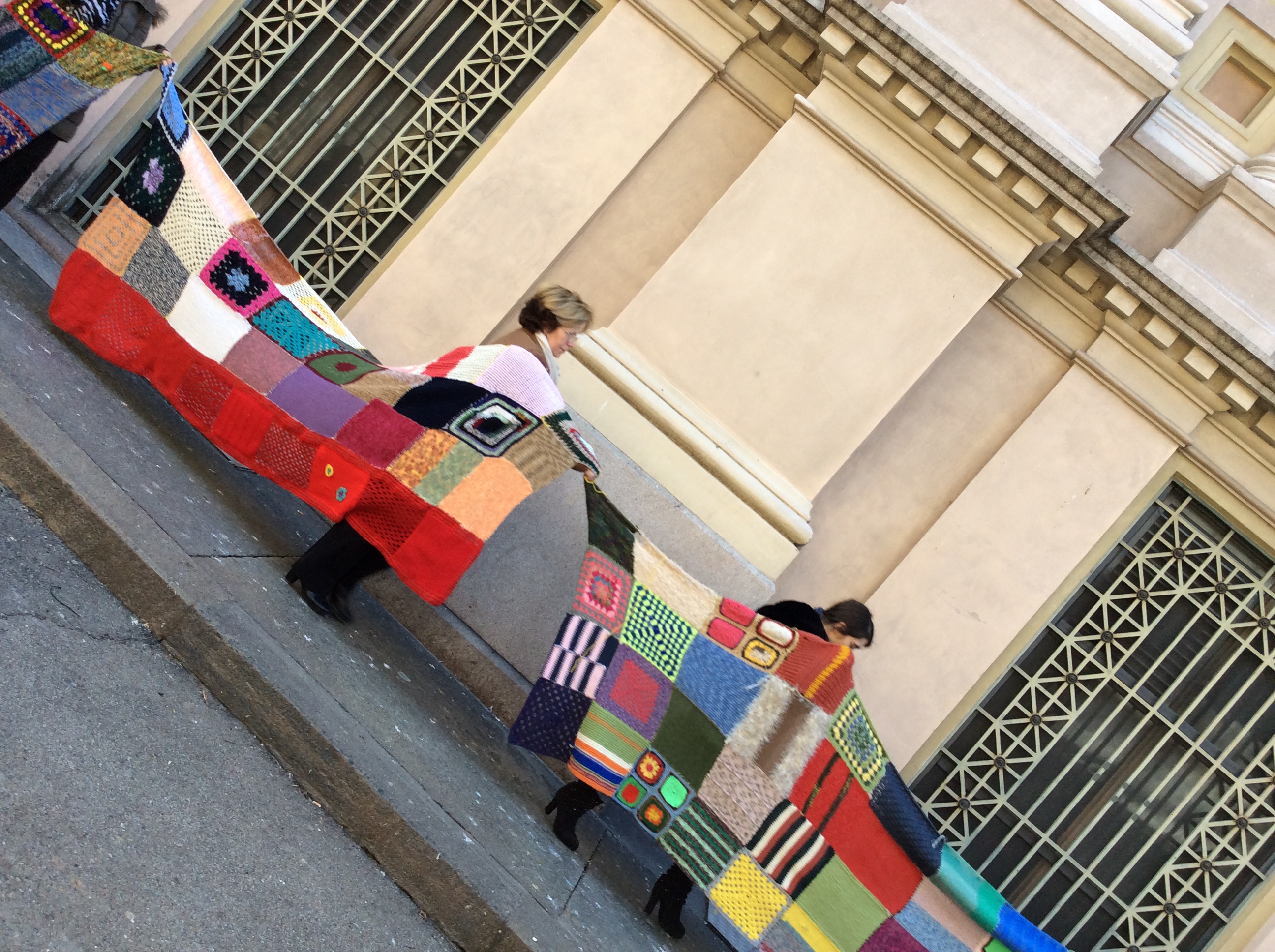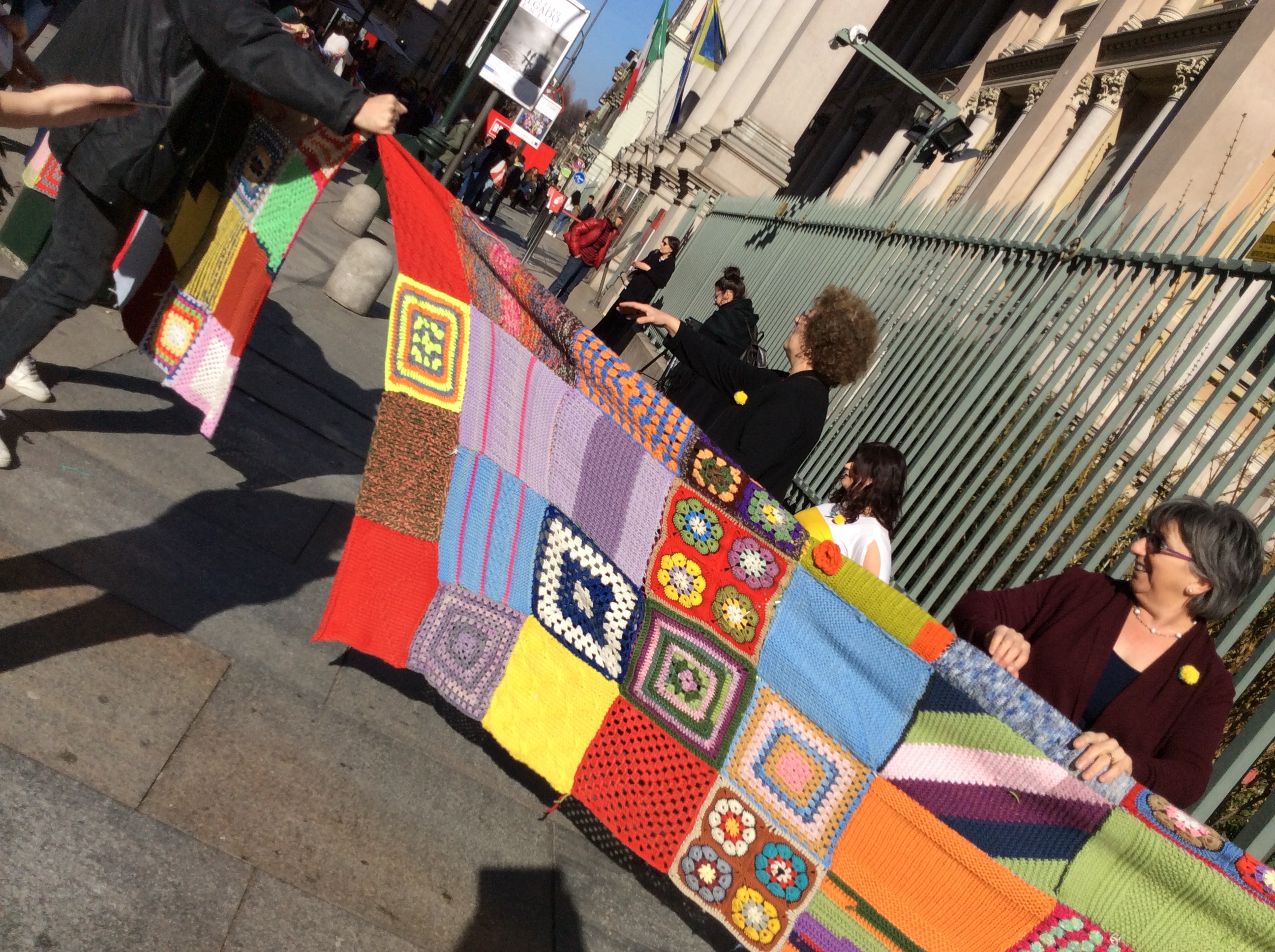 Una sciarpa composta da tante pezzotte di lana tutte rigorosamente lavorate a mano con i ferri o l’uncinetto, si è srotolata intorno alla Mole regalando un tocco di colore che ha rallegrato l’isolato e coinvolto i passanti in un vivace girotondo in questo pomeriggio ricco di sole e luce.